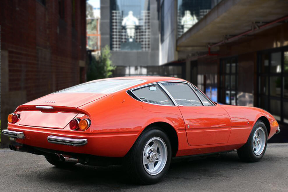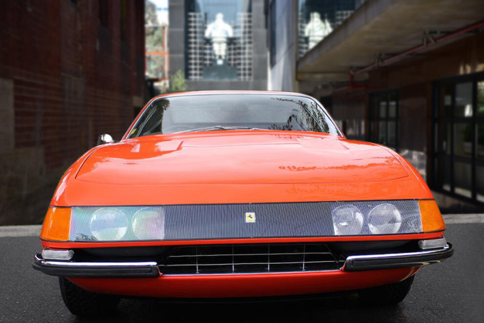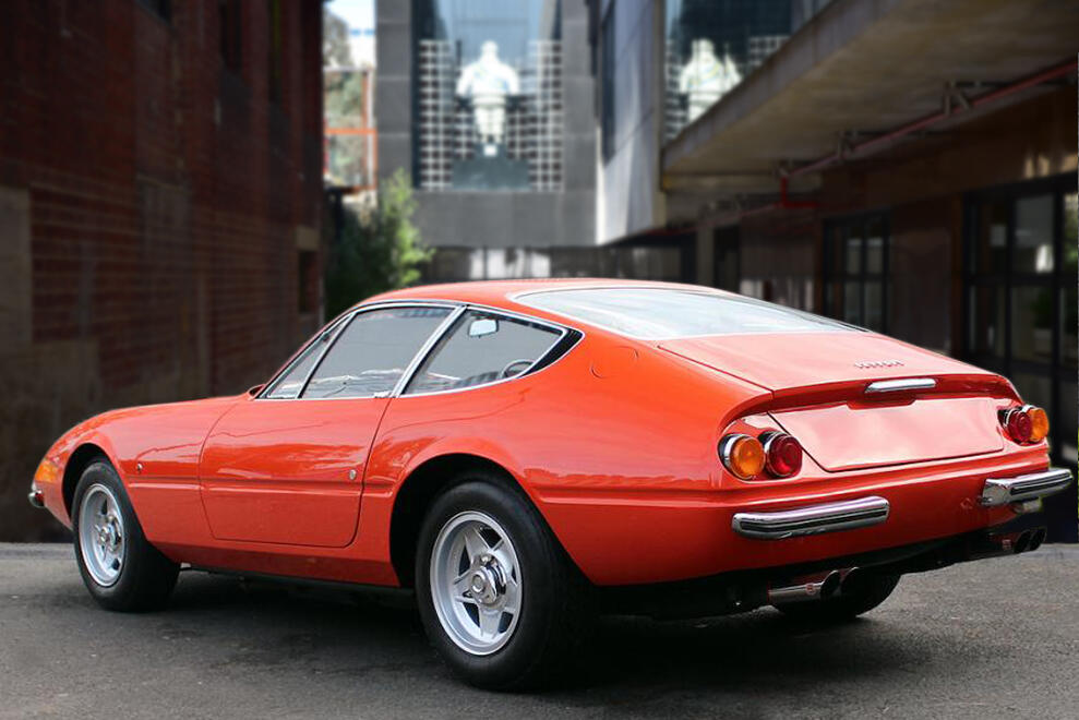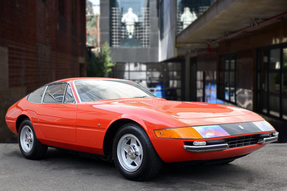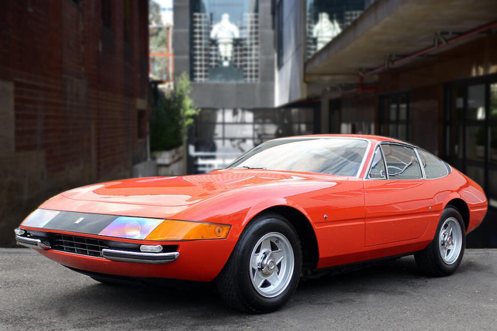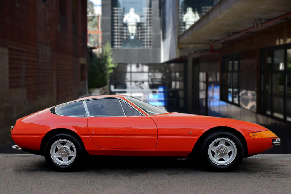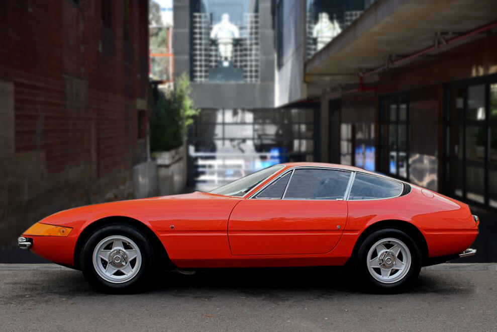 The Ferrari 365GTB/4, better known as the Ferrari Daytona, was the last front engined V12 Ferrari before the switch to the mid-engined Berlinetta Boxer models. Introduced in 1968 at the Paris Motor Show, it replaced the 275GTB/4. The beautiful sharp-edged design was designed by Pininfarina and still looks fantastic today. Early Daytona’s featured fixed headlights behind an acrylic glass cover, these are the so-called and very rare “Plexiglass” cars, of which this example is one; these are the most coveted pure original designs highly valued by collectors and connoisseurs. This particular setup was completely abandoned in 1971 in favour of retractable pop-up twin headlights due to new safety regulations in the US. Leonardo Fioravanti, designer, interviewed on a TV car show had confirmed a popular rumour that it took him 7 days to design the Daytona.