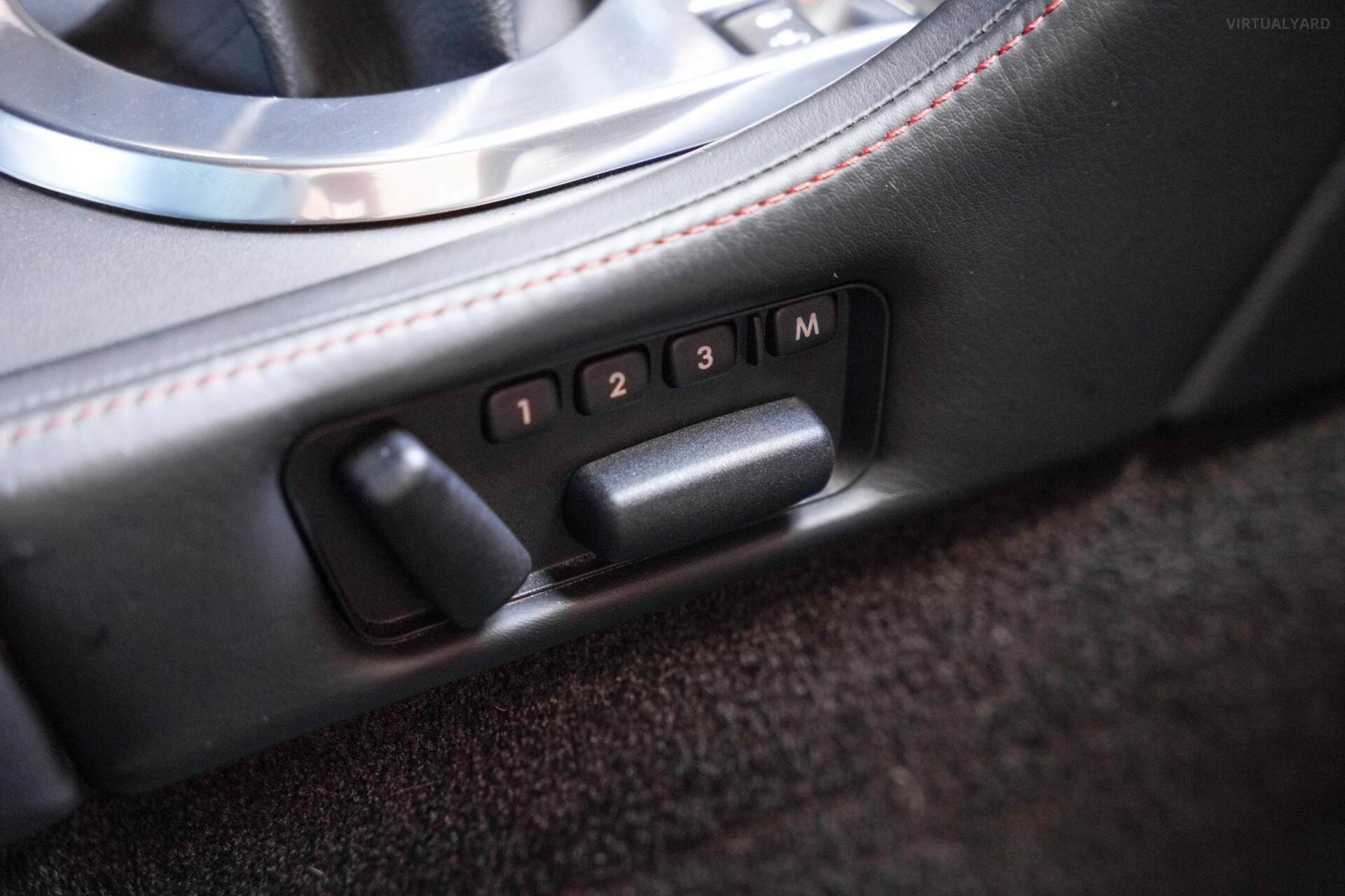 - Leather steering wheel with red inserts.