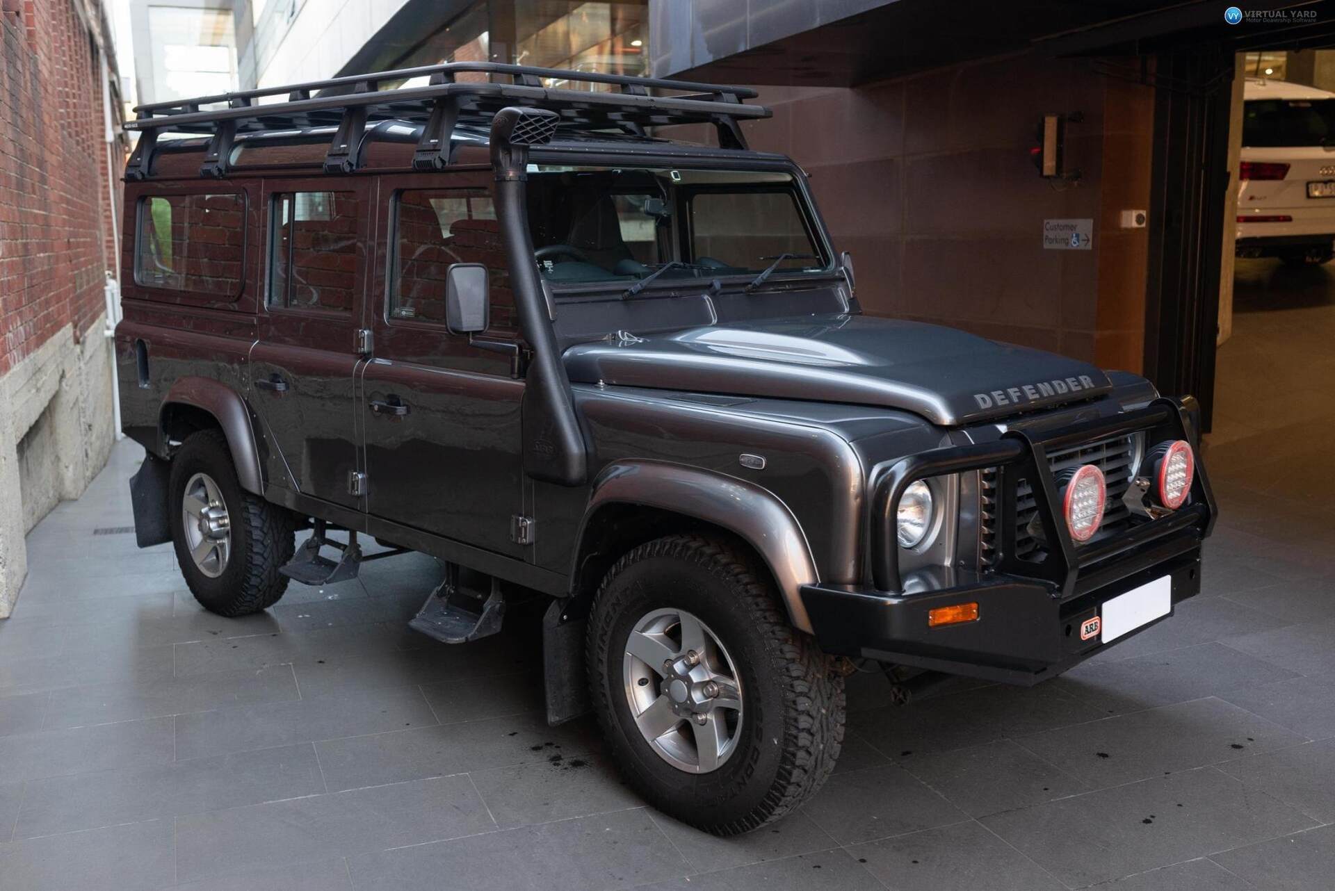 2015 Land Rover Defender, finished in Corris Grey paintwork with black leather interior. This example has travelled 46,499kms.