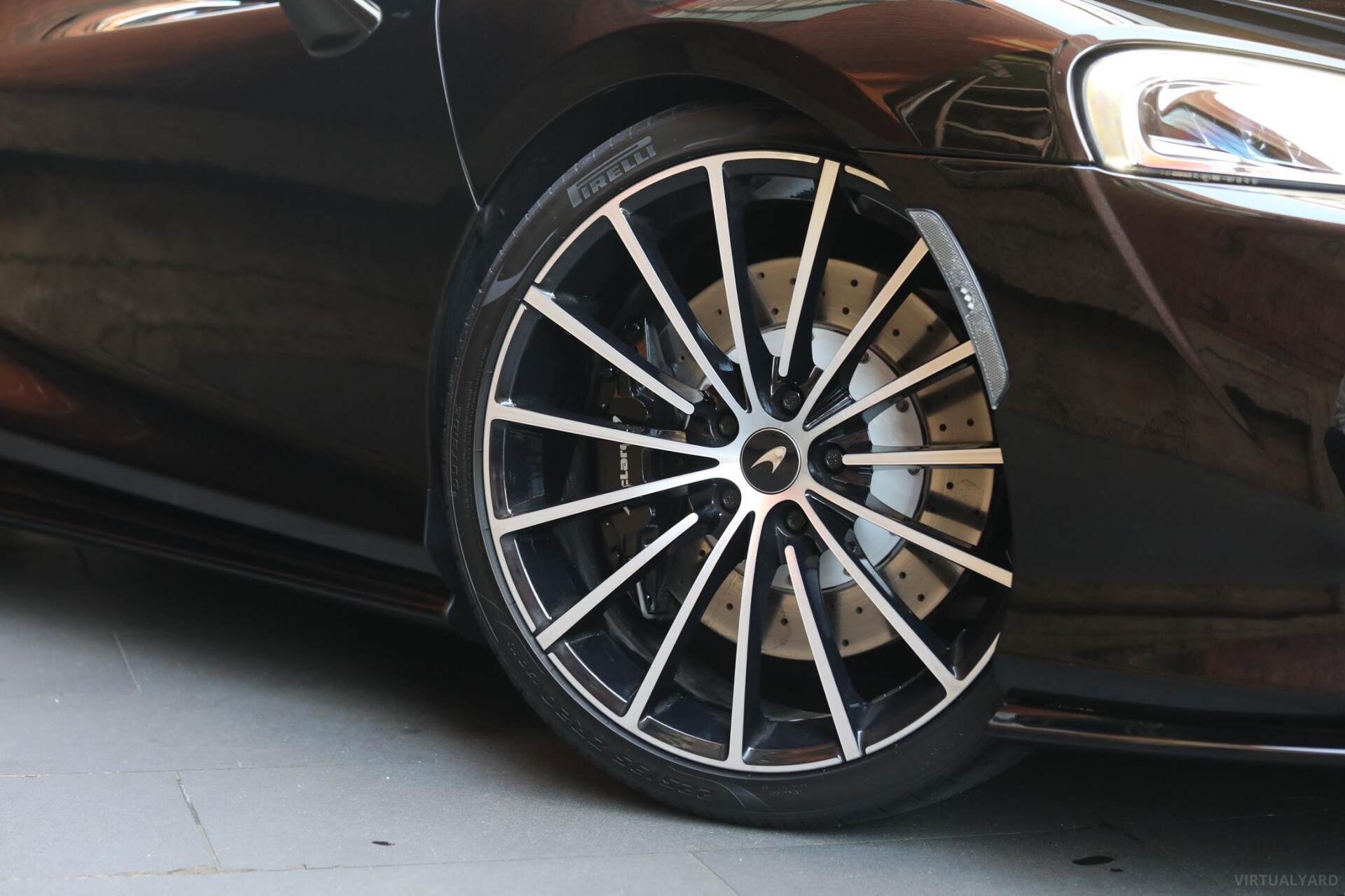 - Black brake calipers with silver logo.