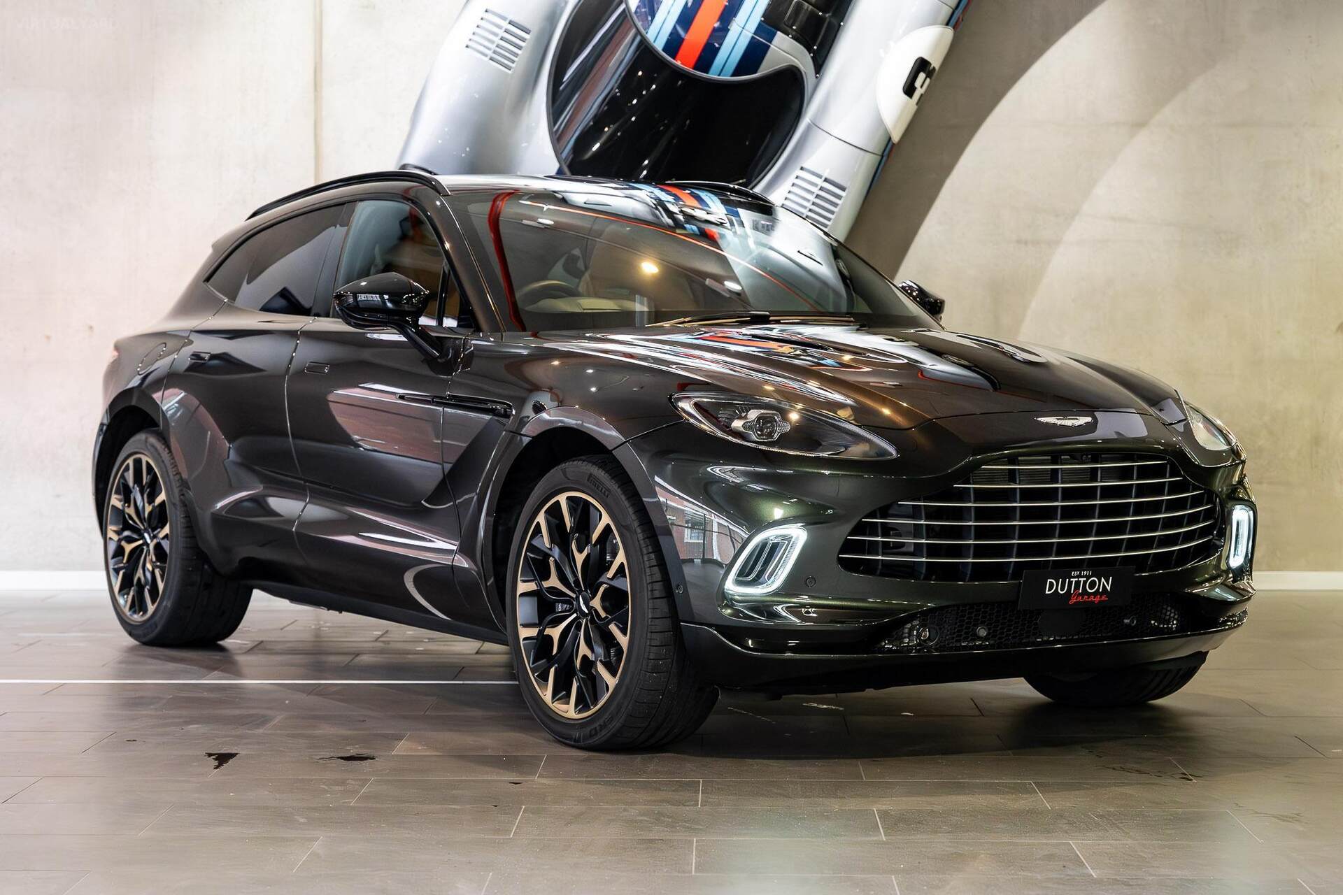 The featured vehicle is a 2022 Aston Martin DBX finished in 'Minotaur Green' Metallic paint with a Tan/Black leather interior. This particular example has traveled 9,499 km and comes with its original documentation and two keys. It features 22-inch Satin black and bronze alloys, an Exterior Gloss Black Package, and a Dark Chrome Jewellery Pack, making it a visually stunning package.