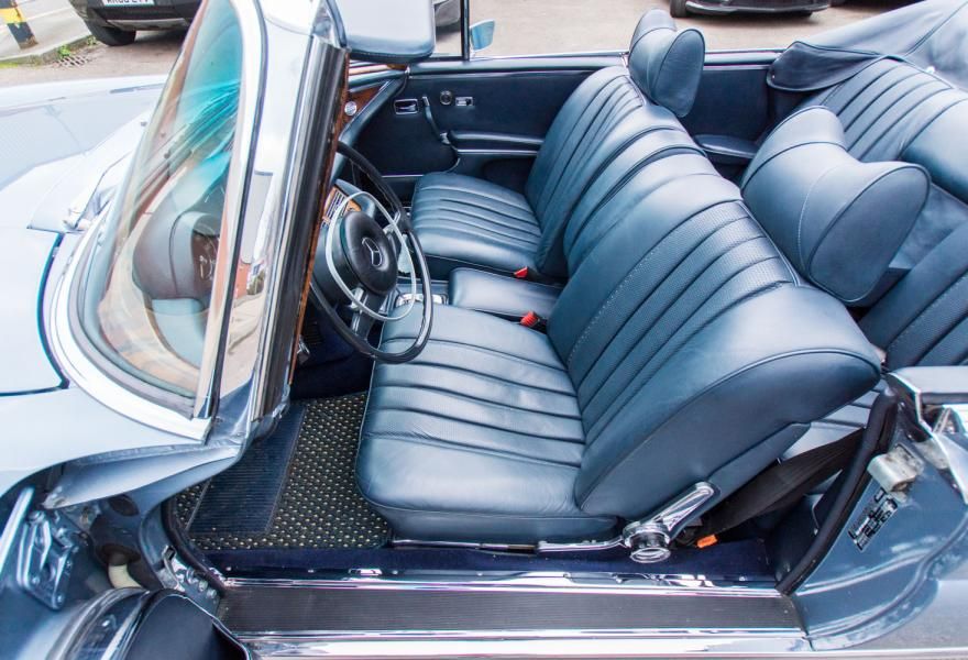 The standard of the car continues to the exterior which is finished in a stunning combination of Ice Blue metallic with contrasting Blue convertible soft-top. Looking fabulous both up and down, the roof functions manually and correctly. There are no scuffs or rips in the material and there are no creases and cracks in the delicate rear window. Complete with the car is the hood-cover, which fits well and completes the open-top touring look. The chrome that surrounds the car is in fine condition and is a pinnacle element to this rare model of Mercedes.